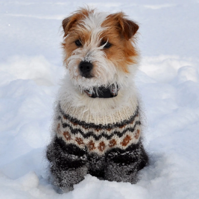 Handgestrickter maßgeschneiderter Hundepullover aus Lett Lopi mit klassischem Island-Muster. Die robuste und naturbelassene Wolle des isländischen Schafs ist sehr gut geeignet für Hundebekleidung, da sie atmungsaktiv ist und kuschelig warm hält. Die natürliche Fettschicht der Wolle ist wasserabweisend. Schmutz lässt sich ganz ein-fach herausschütteln. Die Wolle fängt nicht an zu flusseln und ist auch besonders reißfest.